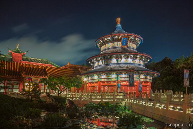 This is the Temple of Heaven in the World Showcase at Epcot in Orlando Florida. It is a replica of the real The Temple of Heaven in Beijing, China where it is an imperial complex of religious buildings. The complex was visited by the Emperors of the Ming and Qing dynasties for annual ceremonies of prayer to Heaven for a good harvest. The Temple of Heaven was inscribed as a World Heritage site in 1998 and was described as "a masterpiece of architecture and landscape design which simply and graphically illustrates a cosmogony of great importance for the evolution of one of the world's great civilizations..." as the "symbolic layout and design of the Temple of Heaven had a profound influence on architecture and planning in the Far East over many centuries."
