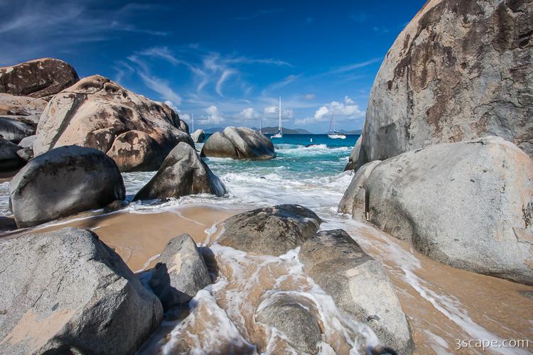 The Baths are a beach area on the island of Virgin Gorda among the British Virgin Islands in the Caribbean. The Baths are situated about a mile south off the main town )Spanish Town) at the southern tip of the island between Spring Bay and Devil's Bay. The Baths are an area of unique geologic formations and one of the BVI's major tourist destinations. At The Baths, the beach shows evidence of the island's volcanic origins, which deposited granite that eroded into piles of boulders on the beach. The boulders form natural tidal pools, tunnels, arches and scenic grottoes that are open to the sea. The largest boulders are about 40 feet long. Since 1990 the area has been a BVI National Park as are the adjacent bays, and the area is a major tourist attraction, with swimming and snorkelling being the main attractions.
