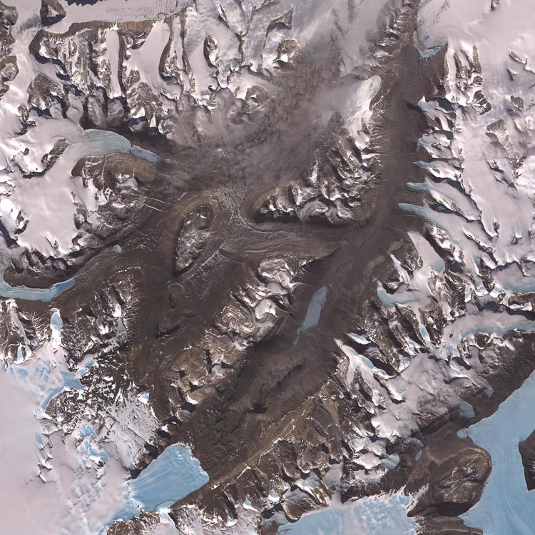 The McMurdo Dry Valleys are a row of valleys west of McMurdo Sound, Antarctica. They are so named because of their extremely low humidity and lack of snow and ice cover. Photosynthetic bacteria have been found living in the relatively moist interior of rocks. Scientists consider the Dry Valleys to be the closest of any terrestrial environment to Mars. Wright Valley extends across the image from lower left to upper right. To the left of it, and partially fog-covered, is Victoria Valley. The image was acquired December 8, 2002, covers an area of 58.5 x 64.9 km, and is located at 77.5 degrees south latitude, 162 degrees east longitude.