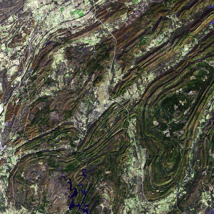 The Ouachita Mountains in southeast Oklahoma are part of the only major mountainous region between the Rockies and the Appalachians. The Ouachitas are fold mountains, formed about 300 million years ago when the South American Plate drifted northward, colliding with the North American Plate. The first recorded exploration by Europeans was in 1521 by Hernando de Soto. Forming part of the Louisiana Purchase, President Jefferson sent William Dunbar and Dr. George Hunter to reconnoiter the area. The image was acquired November 13, 2002, covers an area of 48 x 50 km, and is located at 34.6 degrees north latitude, 95.8 degrees west longitude.