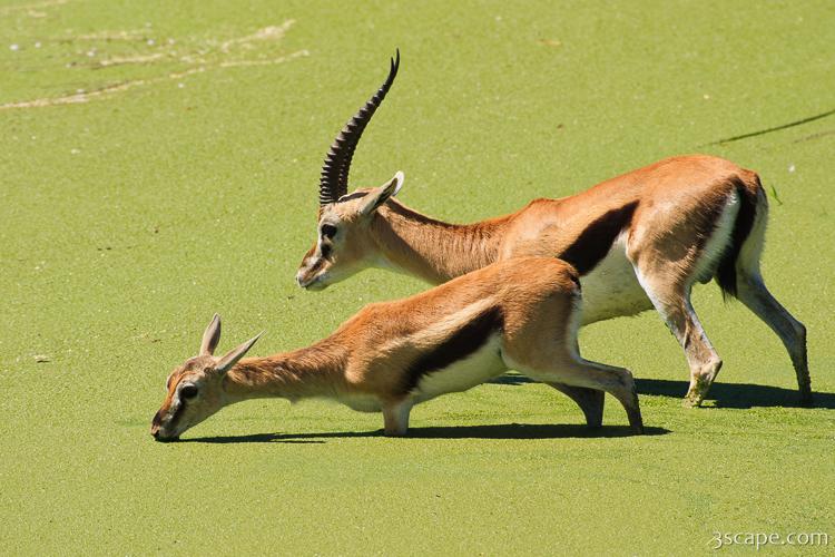 Picture of Thomsons Gazelle testing the algae-filled waters in gallery Serengeti National Park.