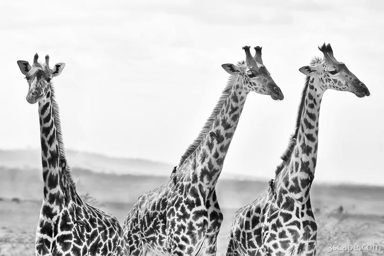 A group of giraffes is called a tower. These three giraffes were photographed on safari near Lake Manyara, Tanzania.