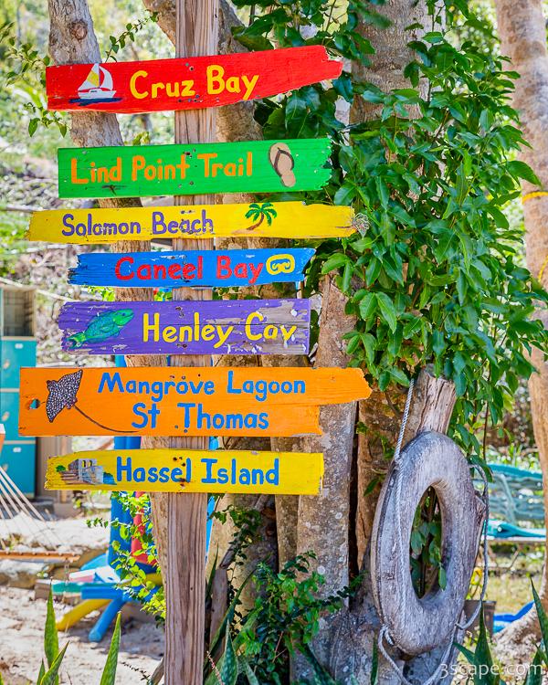 At Honeymoon Beach, near Bakinis Beach Bar, this sign post points out some popular destinations in the US Virgin Islands.