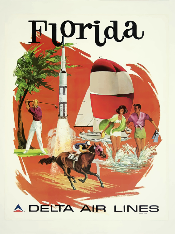 This Delta Airlines vintage poster celebrates Florida’s sun, surf, and leisure, highlighted through cheerful colors and classic illustration. It reflects the mid-century rise of domestic tourism and the jet age. Collectors appreciate its nostalgic charm and Delta’s early branding history. A vibrant piece that adds warmth and retro character to any collection.