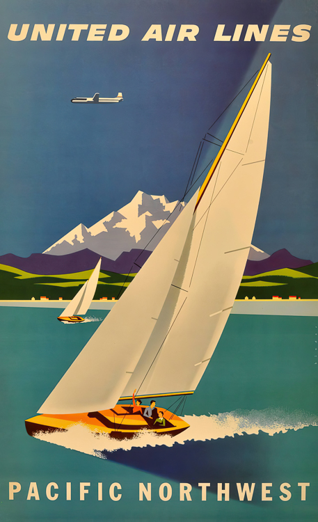 United Airlines’ Pacific Northwest poster features a sailboat gliding under the towering presence of Mt. Rainier. With cool tones and a serene atmosphere, it highlights the natural beauty of the region. Collectors admire its scenic artistry and rare regional focus. A must-have for those who treasure vintage airline posters tied to American landscapes.