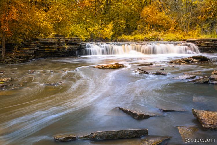 Serene Waterfall Glen in Lemont, Illinois cascades over rocks surrounded by vibrant autumn foliage. The calm water in the foreground reflects the rich hues of yellow and orange from the trees.