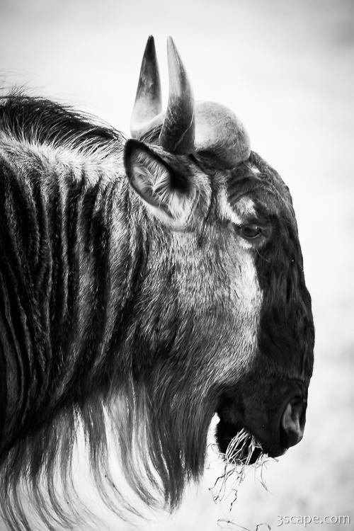 Wildebeest chewing on some grass. Tarangire National Park, Tanzania.