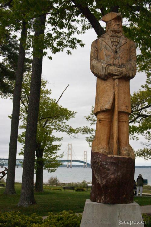 Picture of Wood statue of Alexander Henry, and Mackinac Bridge in gallery Mackinac Island and Mackinaw City.