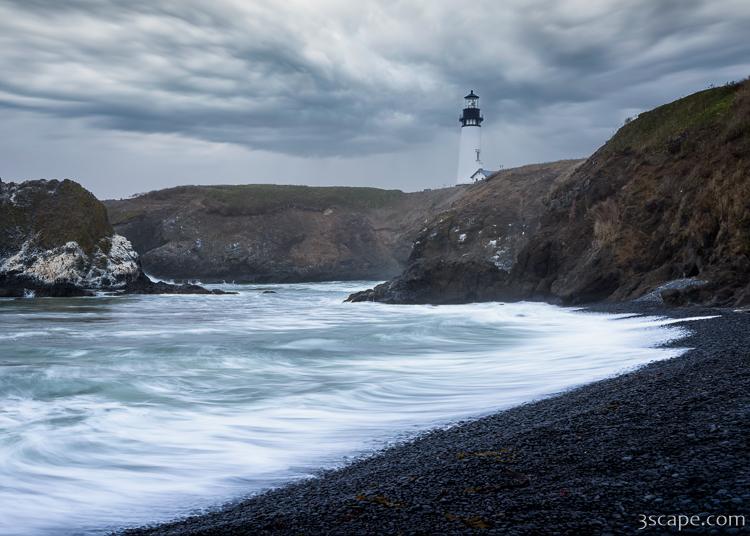 The Yaquina Head Light, also known early in its existence as the Cape Foulweather Lighthouse, is a lighthouse on the Oregon Coast of the United States. It is located in Lincoln County, near the mouth of the Yaquina River near Newport at Yaquina Head. The tower stands 93 feet tall, and is the tallest lighthouse in Oregon. Made in Paris in 1868 and shipped to Oregon, Yaquina Head Light was first lit August 20, 1873, and automated in 1966. It is active with an identifying light characteristic of two seconds on, two seconds off, two seconds on, and 14 seconds off.