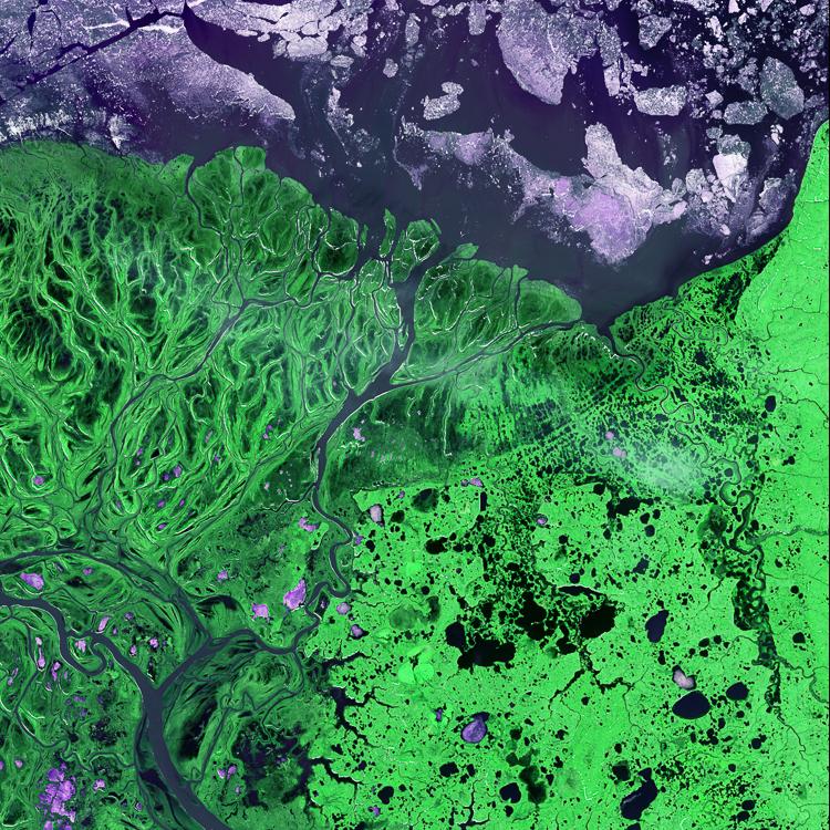 An intricate maze of small lakes and waterways define the Yukon Delta at the confluence of Alaska's Yukon and Kuskokwim Rivers with the frigid Bering Sea. Wildlife abounds on the delta and offshore where sheets of sea ice form during the coldest months of the year.