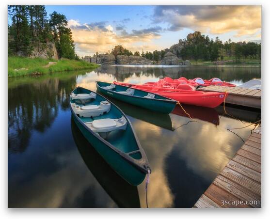 Peaceful lakeside scene featuring vibrant canoes and kayaks moored, surrounded by nature with tranquil waters and a golden sunrise.